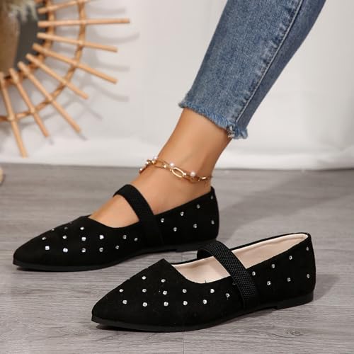 Women's Mary Jane Flats Shoes Pointed Toe Rhinestone Casual Ballet Flats with Ankle Strap Comfortable Suede Dress Shoes for Women Work Office
